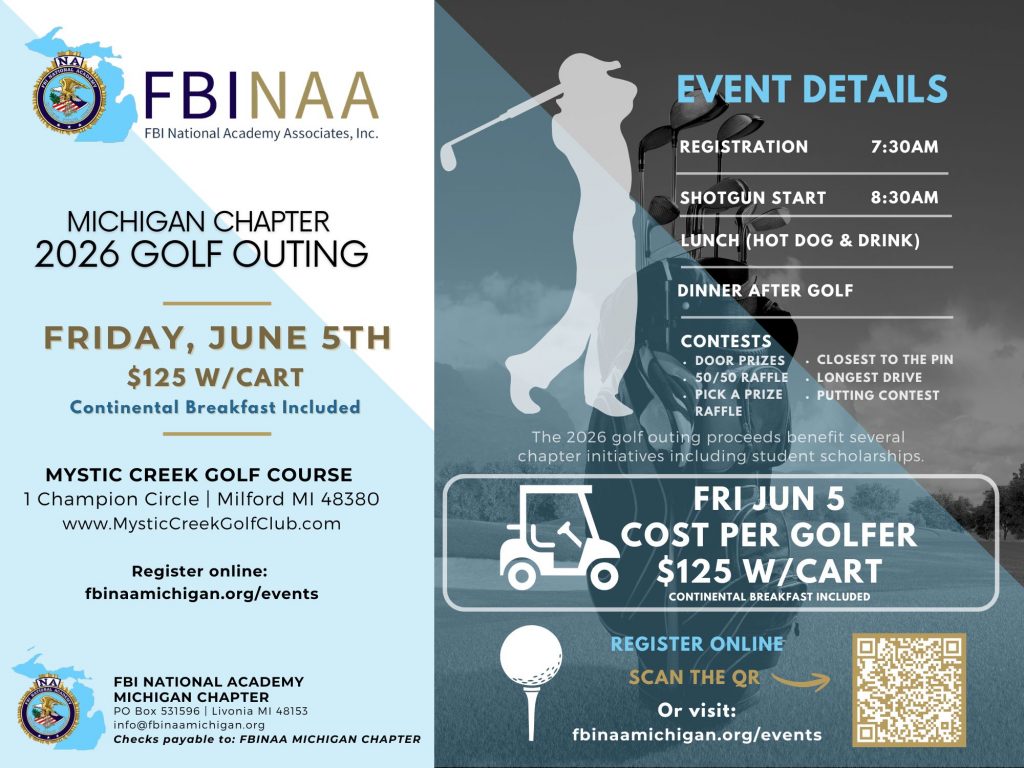 If you have any questions regarding this matter, please feel free to contact Ret. Chief Bob Young, FBINAA Michigan Chapter at 517-749-2739, bobyoung@fbinaafoundation.org, Marty Stress, FBI Detroit at 313-909-2455, mstress@fbi.gov, or Deputy Chief Joshua Monte, FBINAA Michigan Chapter, at 734-552-7075, jmonte@vbtmi.gov.